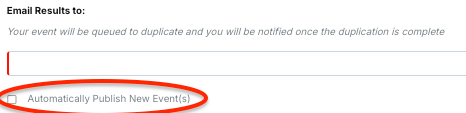 When your event is finished duplicating, you'll receive an email with a link to the duplicated event. Duplicated events will start in draft mode regardless of the publish settings on the existing event, so they'll be hidden until you choose to publish.