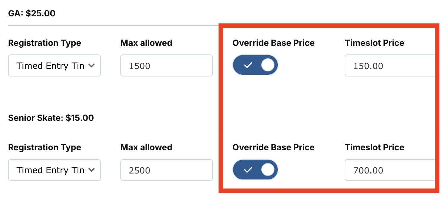For timed entry events, we now support the ability to override prices on individual time slots. Previously, each price point needed to have its own ticket type and each ticket type needed to be sold on a specific time slot. Now, you only need to create a single ticket type for each type of item (ie, General Admission) and set a base price. On each individual time slot, you can override the base price to charge customers.