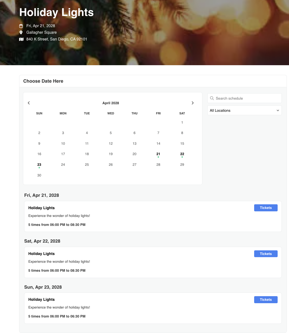 - Main Event Page: This page includes a schedule / activities list showing all your Dates / Access Point information: