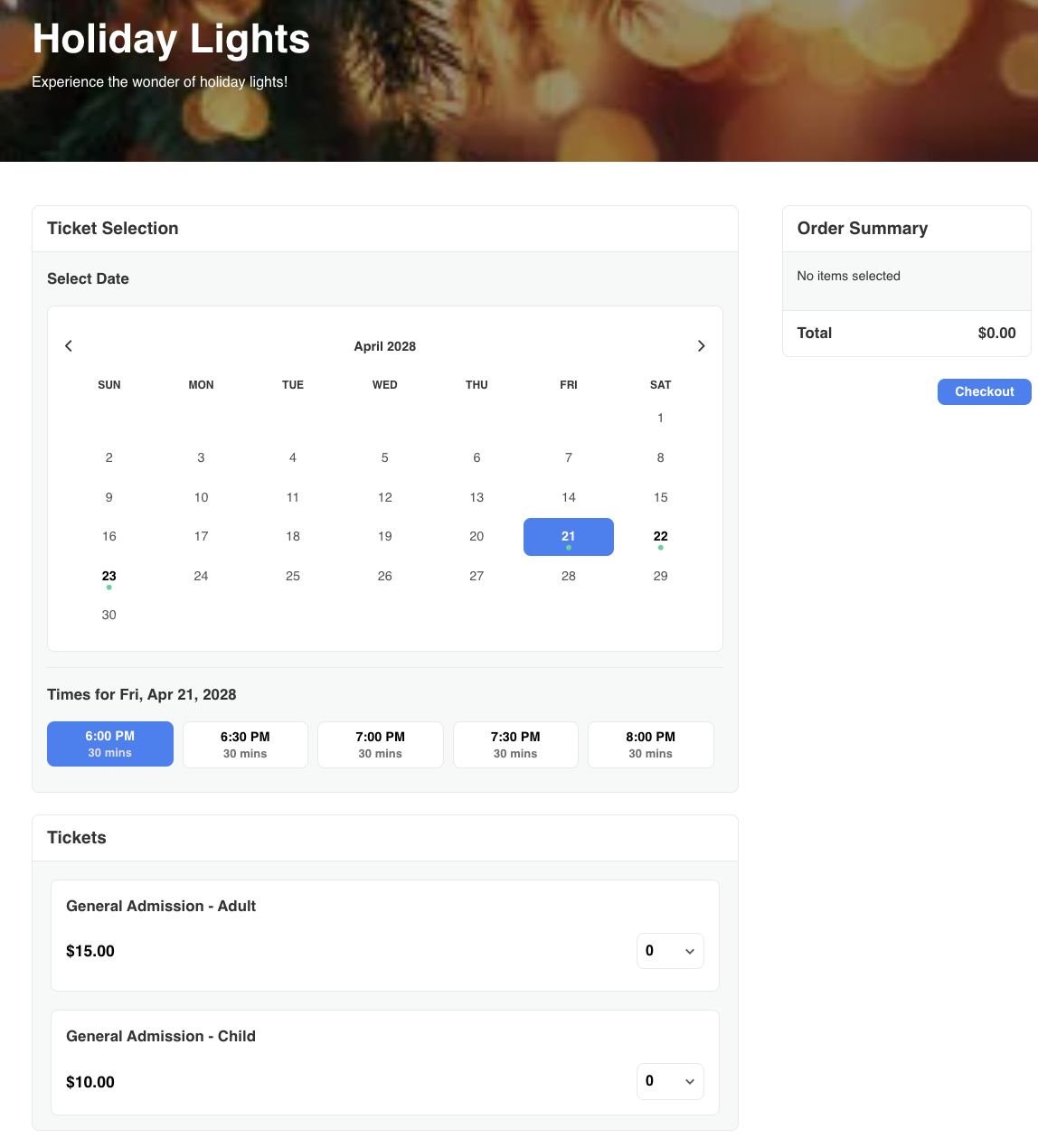 In this example, only tickets for 4/21 appear and then the customer can choose from available time slots and select their desired admission ticket for purchase