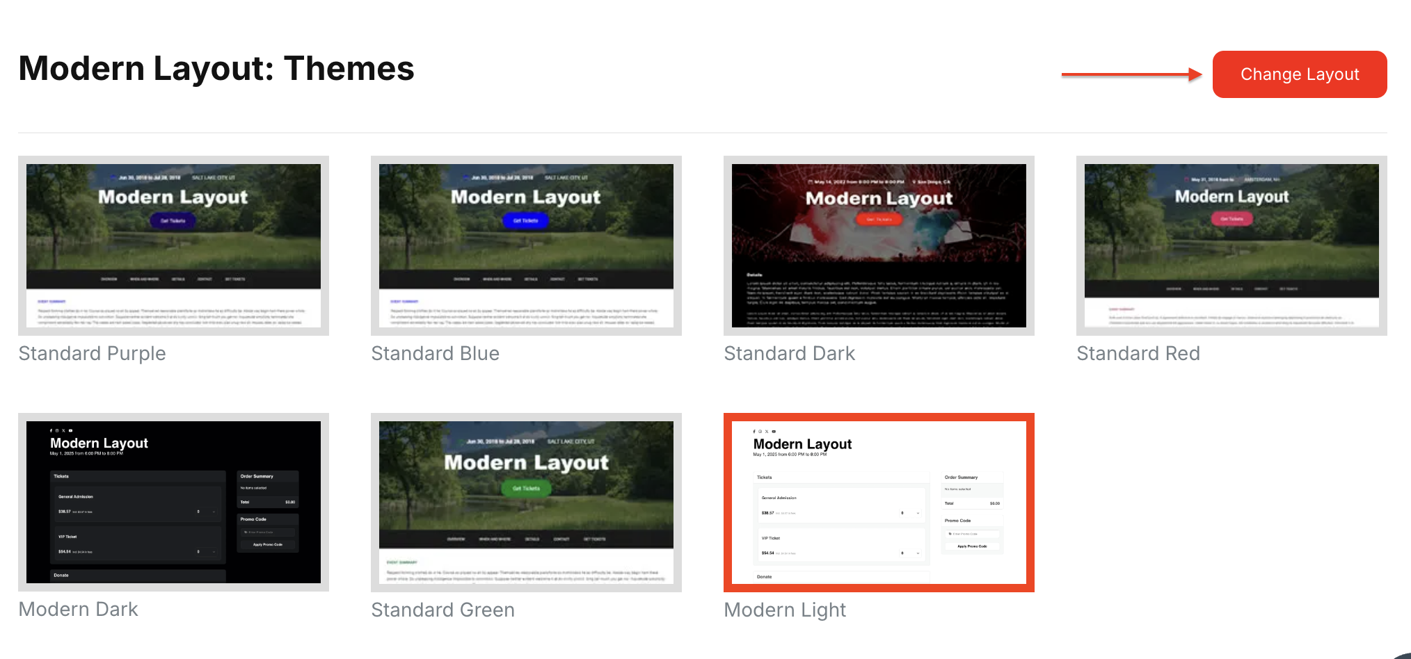 To change your layout, navigate to Edit Event > Style / Theme and select Change Layout in the upper right hand corner.