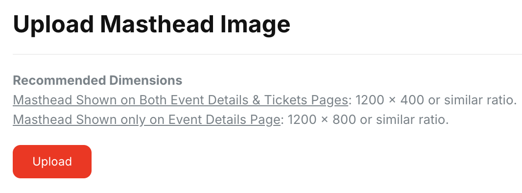 Masthead Style: Choose from a compact header shown on both the event details & tickets pages, or a larger masthead image only shown on the event details page