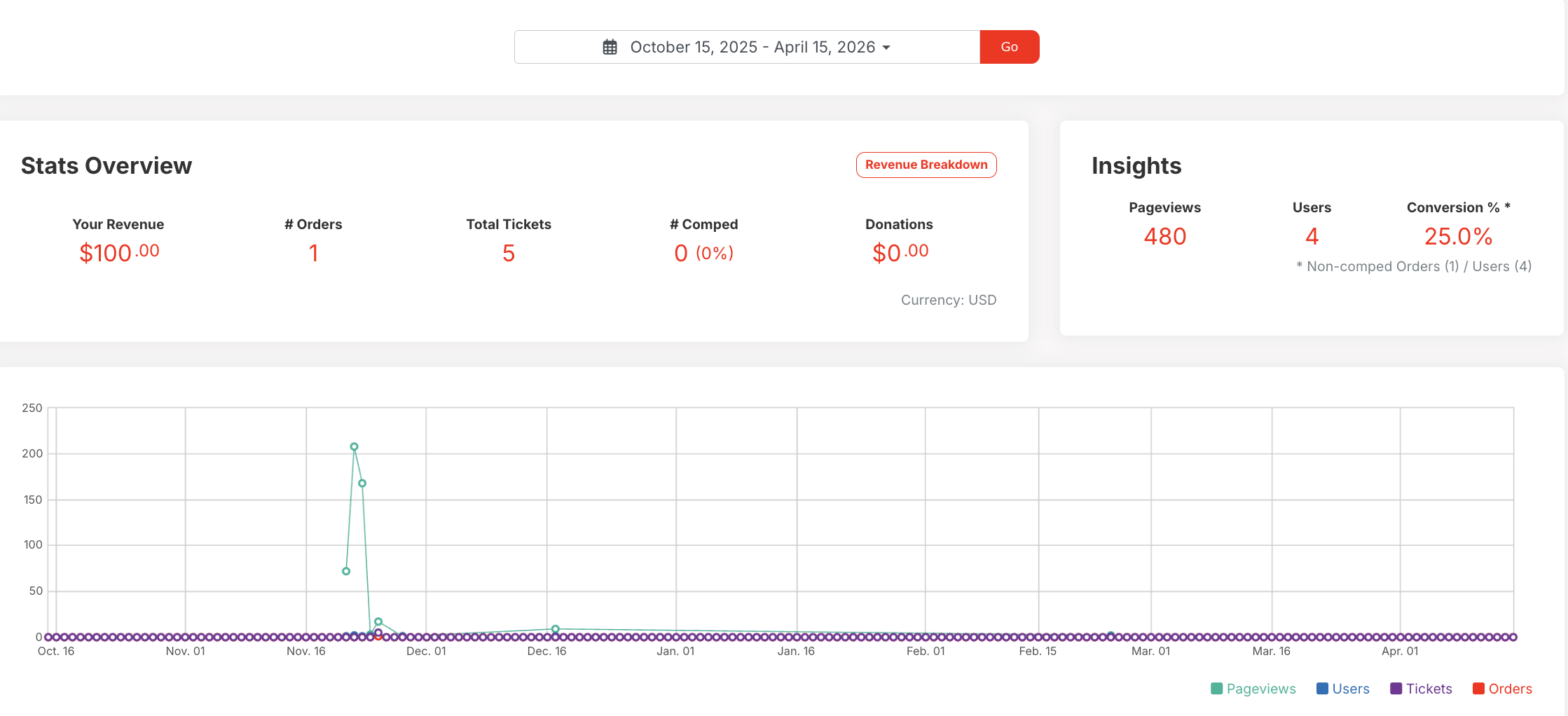 - Stats Overview & Breakdown: Sales information about your event for the given time period