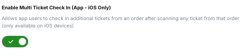 1) On the web platform, turn on Enable Multi Ticket Check In (App) located in Event Settings > More > Box Office & Printing Settings.